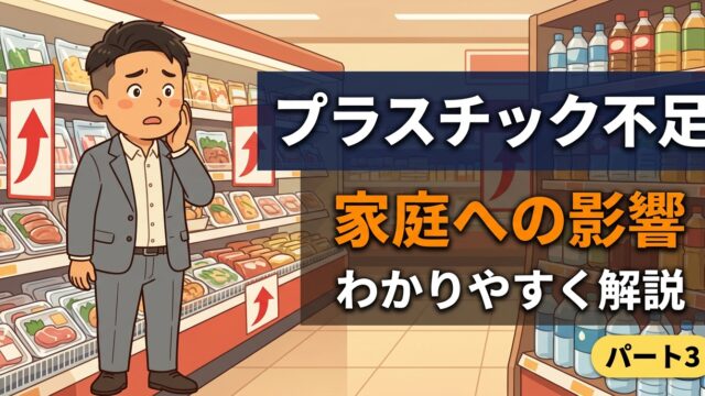 ホルムズ海峡の緊張でプラスチック原料が高騰し、ラップ・ペットボトル・食品トレーなど身近な日用品が値上がりしています。影響は2〜3ヶ月後に家庭へ届く仕組みで、旭化成など大手も値上げを発表済み。元商社マンがわかりやすく解説します。