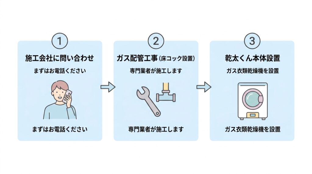 「乾太くんを後付けしたい。ガス配管の工事をお願いできるか」と施工会社に連絡します。