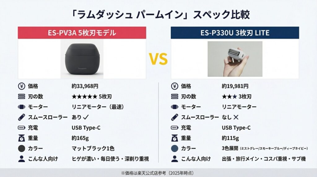 ラムダッシュ パームイン 5枚刃とLITE(3枚刃)の基本スペック比較