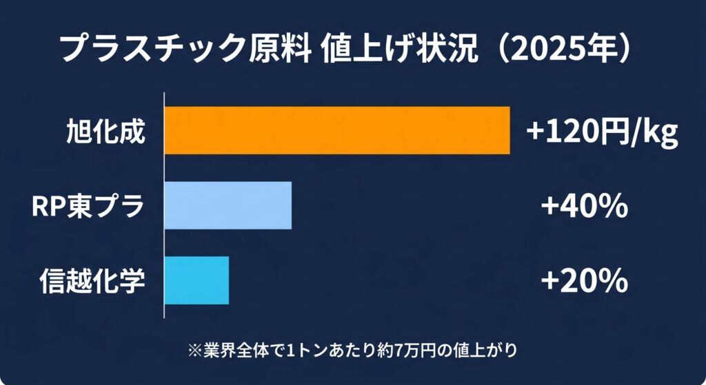 | 中小メーカー(製品全般) | 汎用プラスチック製品 | 10日で1トン7万円上昇、1日コスト21万円増 | 2026年3月時点 |